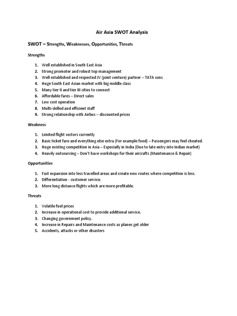 Swot Analysis for Airasia. Airasia Asia can use strengths to create niche positioning in the market can strive to reduce. The four key elements of SWOT analysis are - Strengths Weaknesses Opportunities Threats.